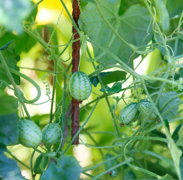 Plante grimpante ou coureuse qui forme de nombreux fruits mouchetés de vert foncé, de la taille d’une olive. Les petits concombres peuvent être dégustés frais ou en lactofermentation.